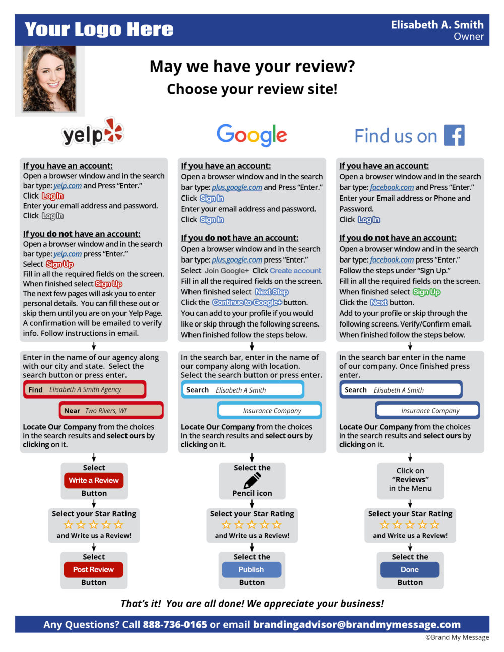 Each review guide is customized to your company’s brand! From your logo right down to your title and address they are made for you and your business.